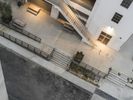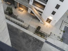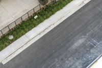 A bird's eye view of a bustling city with roads, asphalt, and walkways surrounded by green grass and lined with tall buildings. The urban landscape is bathed in sunlight on a sunny day.