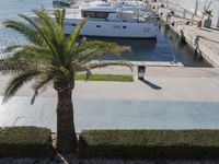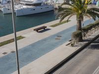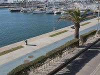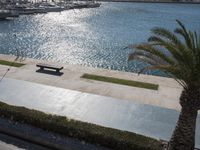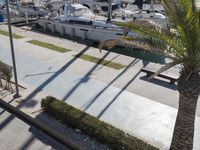 An aerial view of Valencia, Spain, showcasing the city's modern architecture, coastal landscape, and infrastructure. A river and harbor are visible, along with a variety of vehicles, houses, vegetation, and Arecales of Date Palm trees. A clear sky and reflection of the sun create a peaceful atmosphere, perfect for a day of relaxation or vacation.