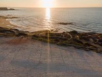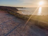 Experience Portugal's stunning coastal landscape from an elevated perspective, where the clear sky and sunshine highlight the open spaces. The ocean sparkles under the sun, while the dirt and gravel surfaces create a unique texture across the terrain. This aerial view captures the essence of Europe's coastal charm, showcasing the beautiful interplay between land and water.