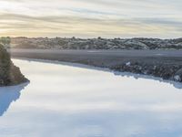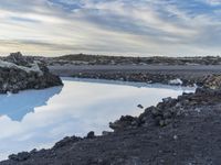 Road winding through the rugged landscape of Iceland with a lake, beach, and coastal lagoon near the horizon. Blue skies, icy atmosphere, and frozen water resources make for a beautiful natural environment with the sun's afterglow illuminating the azure sky, fluffy clouds, and wave-like contrails.