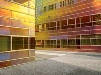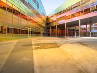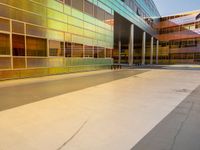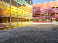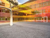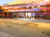 The mixed-use building of a European city skyline in Holland is illuminated by the sunrise, with the amber light highlighting the brick and concrete of the facade, the metal fixtures, the asphalt road surface, and the grass and gravel of the open space