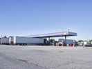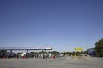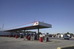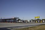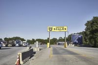 A clear day on a suburban road in the USA with yellow signage and vehicles on the asphalt surface.