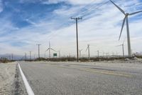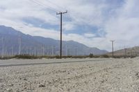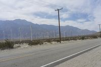 A rural view of a desert landscape in California, USA, with mountains, asphalt road, factory, and windmill in the distance, illuminated by the day's light.
