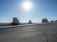 In the heart of the American Southwest, the open roads of Arizona and Utah lead to the iconic Monument Valley. Under the clear skies and shining sun, the asphalt roads cut through the sandy landscape, offering profiles of nature at its most majestic. The sunny weather highlights the vast open spaces, creating a picture-perfect setting for a road trip adventure.