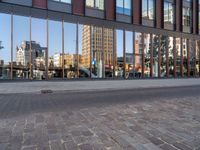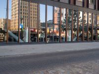 A modern architectural cityscape of Amsterdam, Netherlands. The urban design of the city is highlighted by the glass and composite facade of the skyscraper, the tree-lined thoroughfare, and the cobble stone road surface. The clear sky provides a perfect backdrop to the bustling metropolitan area at dawn.