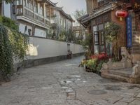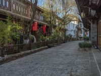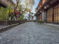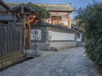 The break of day reveals an ancient Chinese town located in Lijiang, Shangri-La, Yunnan, China. The cobbled stone alley-way features classic architecture, wood and iron facades, a property with a hotel, restaurant, and place of worship, and a residential area filled with homes. The clear sky and sun shine off the road surface, trees, and vegetation. A shrine, temple, and other infrastructure are visible down the small road and straight down the alley-way.