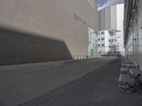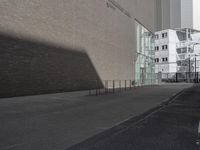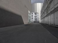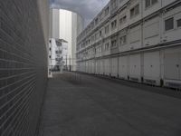 The monochromatic city of Berlin, Germany, is revealed in this snapshot of a low-rise brick-and-concrete building, a white warehouse, a black courtyard, and a grey tree-lined alley-way. This urban design showcases the metropolitan area's modern architecture and infrastructure, providing a glimpse of life in this European metropolis.