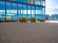 the sidewalk in front of an office building is empty except the sidewalk in front of the building is lined with bricks