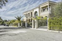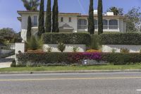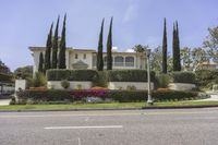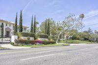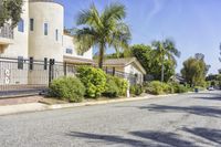 A suburban view of the city of Los Angeles, with a S-curve driveway leading up to a grand estate, surrounded by a botanical garden and hedges. The Arecales biome in Beverly Hills, California is visible in the horizon, with a clear sky and light reflecting off the motor vehicle and asphalt road surface.