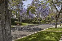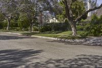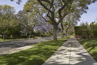 A view of a residential estate in the Beverly Hills neighborhood of Los Angeles, California, USA, featuring a driveway, flower blossoms, trees, and a house in the background. The clear sky and spring sunlight provide an ideal backdrop for this suburban landscape.