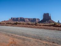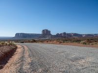 In the heart of the American Southwest, the iconic Monument Valley spans the states of Arizona and Utah. Clear skies provide the perfect backdrop for the rugged landscape, with dirt and gravel roads cutting through the vast expanse. The straight roads offer a unique perspective, leading off-road adventurers on a journey through nature's beauty under the sunlit sky.