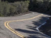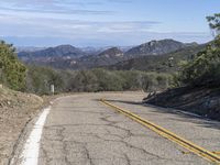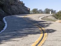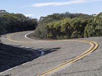 An aerial view of an armco barrier along the S-curve of the Pacific Coast Highway in California, USA. The scene is illuminated by the evening afterglow, highlighting the chaparral biome with its lush grass and succulent plant life, alongside the desert sand and dirt of the highway. The view overlooks the mountain range and the reservoir, and the grey sky provides a contrast to the yellow wildflowers and the green trees.