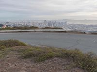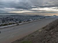An aerial view of an Armco barrier on a California highway overlooking the city of San Francisco and the ocean. The grey sky highlights the urban and suburban infrastructure of the metropolitan area.