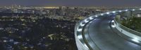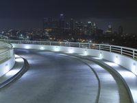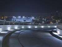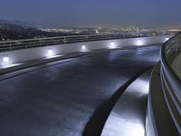 A view of the Armco Barrier in the evening in Los Angeles, California, USA. A cityscape of modern architecture, highways, trees, and rivers can be seen, illuminated by artificial light and the reflection of the clear night sky.