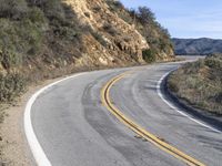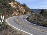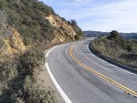 Aerial view of Armco barrier on the S-curve of the Pacific Coast Highway in California, USA, illuminated by the evening afterglow. The winding highway surrounded by chaparral biome, lush vegetation and sand street, dotted with motor vehicles, against the backdrop of a mountain range and a clear sky.