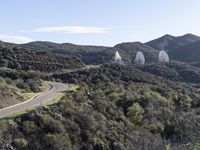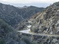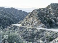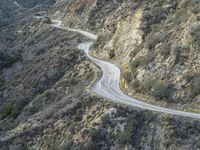 An aerial view of an Armco barrier winding through a S-curve on the Pacific Coast Highway in California, USA. The scene is illuminated by the golden afterglow of the setting sun, and the surrounding chaparral biome is composed of a variety of cacti, grass, and shrubs. The road passes through a mountain range, with a fault line visible on the rocky outcrops, and a reservoir visible in the valley below.
