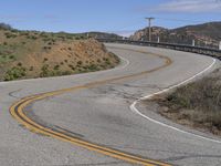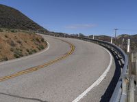 An aerial view of the Armco barrier along the S-curve of the Pacific Coast Highway in California, USA. The afterglow of the evening sun highlights the grey sky, lush vegetation, and rolling hills of the chaparral biome. Automobiles and contrails can be seen against a backdrop of sand, grass, and dirt.
