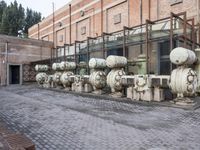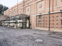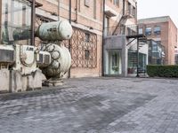 A bustling metropolitan area featuring a brick walled alley-way, stone flooring, and a public space with an industrial sculpture and monument in the 798 Art District of Beijing, China.