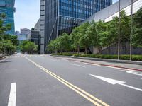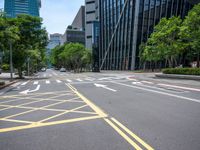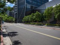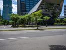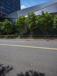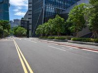 A view of modern architecture and urban design in Taipei City, Taiwan, with a roadway, glass wall, and vegetation in the foreground illuminated by sunlight.