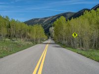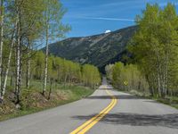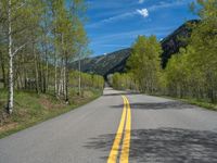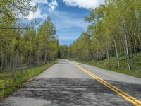 In the scenic landscape of Aspen, Colorado, roads cut through the forest, casting shadows under the clear day sky. The asphalt roads lead straight down the mountainous terrain, with trees lining the rural path. Hard shadows play across the road, creating a picturesque scene of nature's beauty. Clouds drift lazily above, adding to the tranquil atmosphere of this one-quarter rural area in the USA.