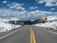 In the heart of Colorado's stunning landscape, Aspen's snowy mountains and asphalt roads create a picturesque winter scene. Clouds float above the snow-covered peaks, offering a serene backdrop to the road leading straight down to the summit. Nature's beauty shines through on this day, as one-quarter of the USA's winter wonderland unfolds before you.