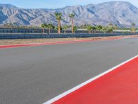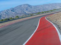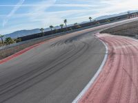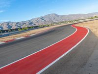 A race track curves around a clear sky day in the United States, with racing cars on the road below.