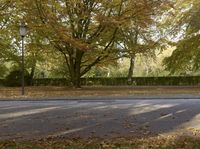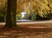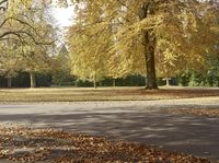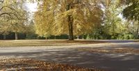 A paved road passes through a natural environment with deciduous trees, yellow grass and leafy vegetation in the woods of Hamburg, Germany on a sunny autumn day in Europe.