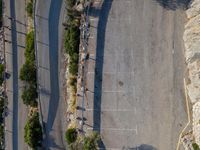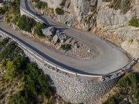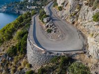 A top-down aerial view of a coastal road surrounded by nature, with an Armco barrier, a parking lot, and a switchback curve, located in Mallorca, an island part of the Balearic Islands archipelago in Europe.