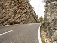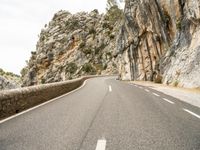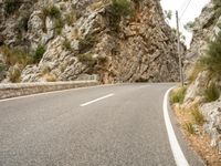 A straight road lined with an Armco barrier, with rock walls, clouds and nature in the background, in Mallorca, Spain, on the Balearic Islands in Europe.