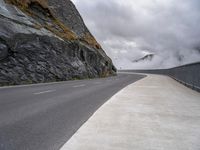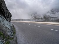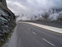 A dramatic landscape of tar-covered roads and mountain landforms in Austria, with a guard rail, fog, vegetation, and birds in the backdrop. A great example of infrastructure, the thoroughfare is a popular mode of transport through Europe's highlands.