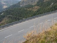 An aerial view of the rural Austrian landscape, showing a winding road with switchbacks, curves, and an Armco guardrail in the foreground, with mountains and open space in the background.