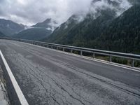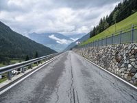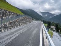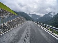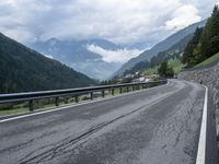 A winding road in Austria with a grey sky stretching straight down the road, guarded by an Armco barrier, on a gloomy day in Europe's beautiful landscape.