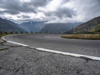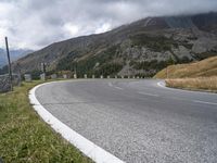 A view of an asphalt road winding through the mountain landscape of Austria, Europe. Tire tracks and tar are visible on the road surface, while the grass surface and vegetation form a slope towards the horizon. The sunlight shines down on the guard rail, Armco barrier, and bridge, alongside cumulus clouds and grey sky. The lane is parallel to a nearby water resource, and the mountain landforms with trees provide a rural backdrop.
