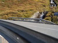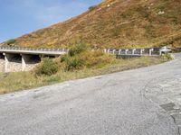 A winding asphalt road curves through the mountainous landscape of Austria, with an Armco barrier in the foreground and a bright, clear sky above. This packshot of the natural European environment showcases the open space and beautiful surface of the land during the day.