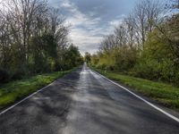 A woody plant stands in the middle of a lush green field, surrounded by a tar road and clear sky. The autumn landscape is illuminated by sunlight, providing a glimpse into the rural infrastructure of Europe.