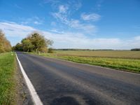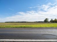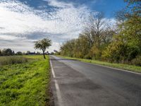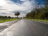 A natural environment of lush vegetation, grass, trees, and cumulus clouds along a rural road in the countryside of Berlin, Germany. The horizon is filled with colorful nature and the asphalt road surface is illuminated by sunlight.