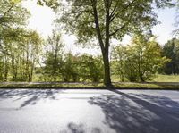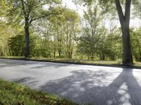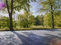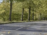 A leaf-covered lane illuminated by sunlight in the natural environment of Hamburg, Germany, leading to a forest of woody plants and vegetation along a thoroughfare of asphalt and grass.