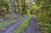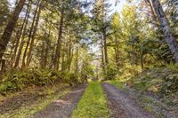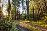 A low angle view of a straight road through a temperate broadleaf and mixed forest in Bellingham, Washington. The road is surrounded by lush vegetation and colorful autumn leaves. The sunlight filters through the trees, creating a beautiful scene in the wilderness.