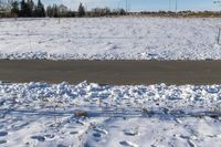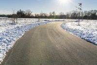A high road covered in snow winds through a beautiful autumn landscape in Toronto, Canada under a clear sky with the sun visible.