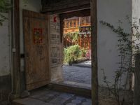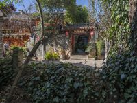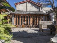 A view of an alley-way lined with Japanese architecture in Lijiang, China on a clear autumn day. A bicycle sits in the foreground, while a Shinto shrine, botanical garden, and other residential buildings can be seen in the background.