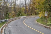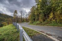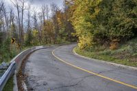 A scenic view of a winding road surrounded by lush autumn foliage in a peaceful forest.