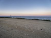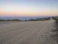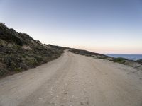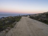 The morning sun casts a glowing light over the coastal landscape of Portugal. A dirt and gravel road winds through a grassy plain, flanked by trees, vegetation, and a lake. In the background, the shoreline stretches along an ocean of rolling waves, while a mountain and its landforms stand in profile against a clear, cloud-speckled sky.