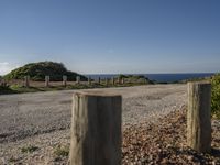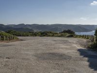 A beautiful day in Portugal along the coast, featuring an armco barrier, trees, grass, and a mountain landform in the background. The sun is shining on the asphalt road, providing a hard shadow on the grass surface and clear blue skies with a few clouds in the horizon.