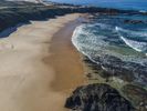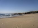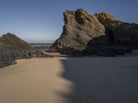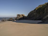 A breathtaking view of the shoreline in Portugal, with its azure ocean, sandy beaches, and rocky shoreline. The clear sky and hard shadows provide an interesting contrast to the terrain, while the waves and wooded banks add to the beauty of the landscape.