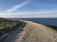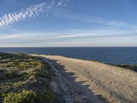 A straight road of sand and gravel winds through a European mountain landscape of grass, beach, and vegetation. The azure bank of the ocean runs in the background under a clear sky, and sunlight glints off the horizon of the water.