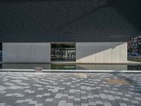 a white building next to a pool in a courtyard area with a walkway leading into it