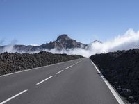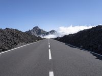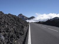 An Armco barrier lines the road as it winds through the alpine landscape of Tenerife, Spain. The clear sky and low mountain range provide an uninterrupted view of nature and infrastructure, from the asphalt roadway surface to the volcanic lava desert.