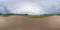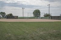 A grass surface baseball field can be seen in a residential area of Bancroft, Iowa. There is open space with a tree, pasture and vegetation in the background with a grey sky. This recreational area is a great place for a sport like baseball and other recreational activities.