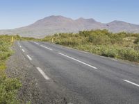 The lush vegetation and rolling mountain landforms of Iceland provide a stunning backdrop to the infrastructure and thoroughfares of the island nation, seen from a straight down the road vantage point on a clear day.