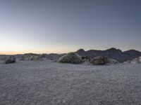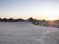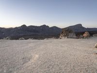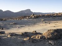 The sun rises above the badlands of Tenerife, an island of Spain located in the Atlantic Ocean off the coast of Europe. The clear sky reveals the rugged landscape of the mountainous wilderness, with its rocky surfaces, sandy dirt, gravel soil, and wadis, illuminated by the soft morning light.
